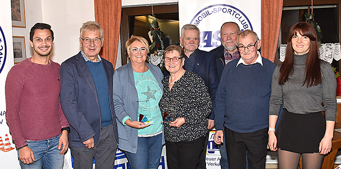 Unsere langjährigen Mitglieder: von links; Mario Farnbacher (25 Jahre), Hermann Farnbacher (50 Jahre), Brigitte Meyer (40 Jahre), Hildegard Volkmer (40 Jahre), Heinrich Hartung (60 Jahre) Gerhard Büchler (50 Jahre), Fritz Schopf (50 Jahre) und Daniela Schopf (25 Jahre)